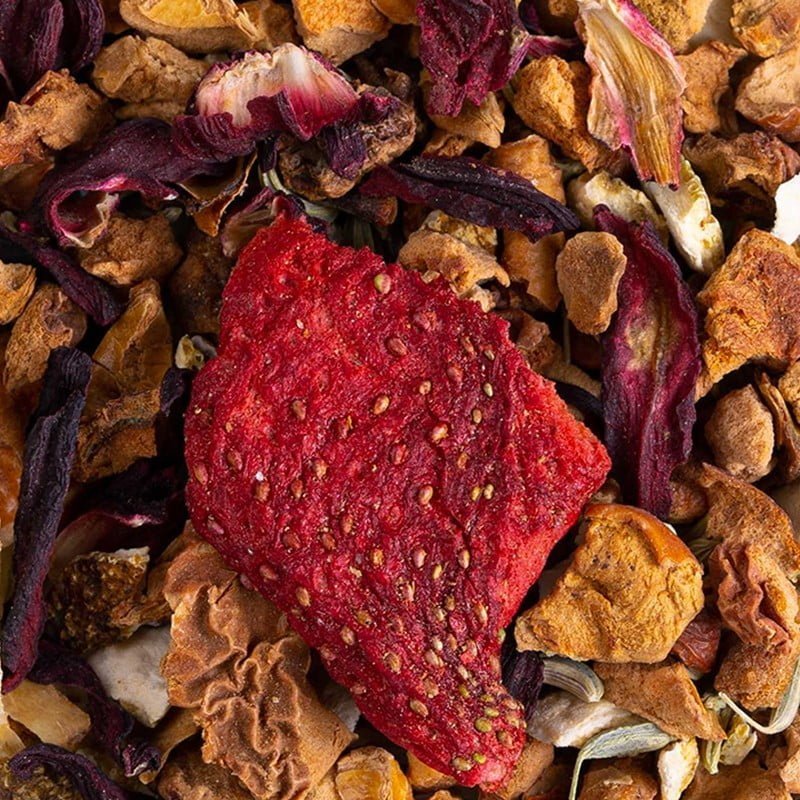 Appelsinskal og fennikel tilfører en subtil friskhed, mens hibiscus bringer en let syrlighed, der balancerer de sødere noter perfekt. Den naturlige jordbær- og appelsinaroma intensiverer frugtigheden, hvilket gør hver kop til en sand nydelse.